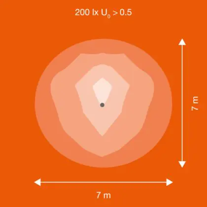 Der Abstrahlwinkel bezeichnet den Winkel, in dem das Licht aus der Lichtquelle ausgestrahlt wird. Er wird in Grad (D) angegeben. Je geringer die Gradzahl des Abstrahlwinkels ist, desto kleiner ist auch der Durchmesser des Lichtkegels, den die Lichtquelle produziert. Beispiel: Wird eine Lampe mit einem Abstrahlwinkel von 60 Grad an der Decke (2,5 m Höhe) angebracht, erzeugt sie einen Lichtkegel von 2,9 Metern Durchmesser. Hat die Lampe hingegen einen Abstrahlwinkel von 120 Grad, beträgt der Lichtkegel 8,7 Meter im Durchmesser. |