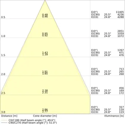 Der Abstrahlwinkel bezeichnet den Winkel, in dem das Licht aus der Lichtquelle ausgestrahlt wird. Er wird in Grad (D) angegeben. Je geringer die Gradzahl des Abstrahlwinkels ist, desto kleiner ist auch der Durchmesser des Lichtkegels, den die Lichtquelle produziert. Beispiel: Wird eine Lampe mit einem Abstrahlwinkel von 60 Grad an der Decke (2,5 m Höhe) angebracht, erzeugt sie einen Lichtkegel von 2,9 Metern Durchmesser. Hat die Lampe hingegen einen Abstrahlwinkel von 120 Grad, beträgt der Lichtkegel 8,7 Meter im Durchmesser. |