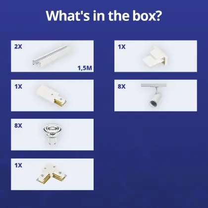 | Nom du fabricant | Complete L shaped 1-Phase Track Set White incl. 8x Spot fixture + GU10 2700K 3W Dim – 1.5 x 1.5 mete | |