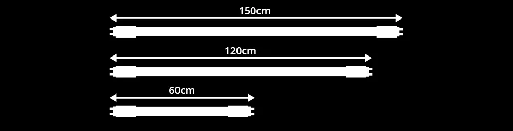 ![]() Les longueurs les plus courantes des tubes LED T8 sont 60cm, 90cm, 120cm et 150cm. Pour les tubes LED T5, il s'agit de 55cm, 85cm, 115cm et 145cm. Vous passez aux tubes LED ? Vérifiez toujours la longueur de votre tube fluorescent actuel. |